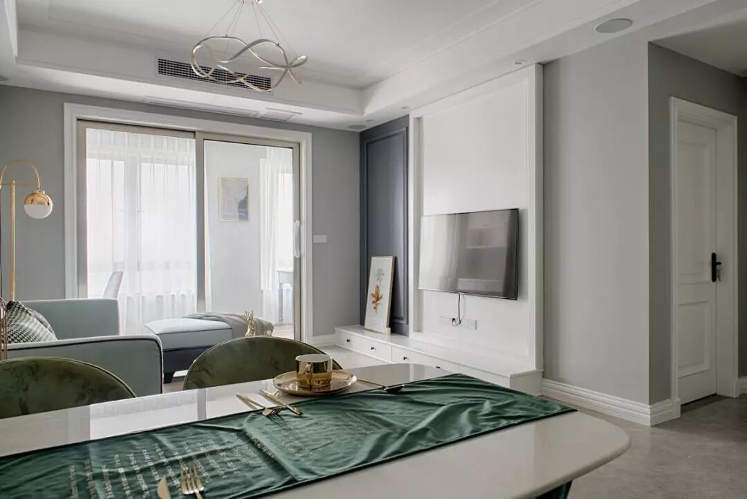 ▲ 不对称电视墙利用边框造型划分空间,结合一个矮柜电视柜,清爽大方又不失大气雅致。