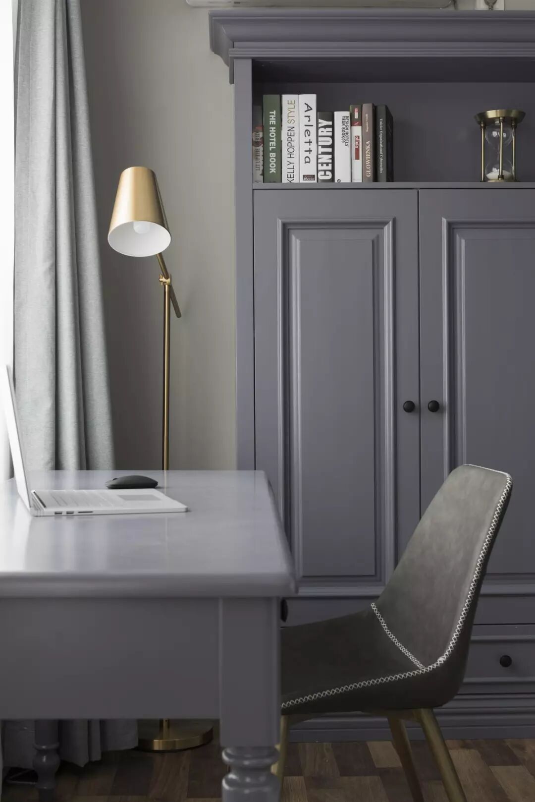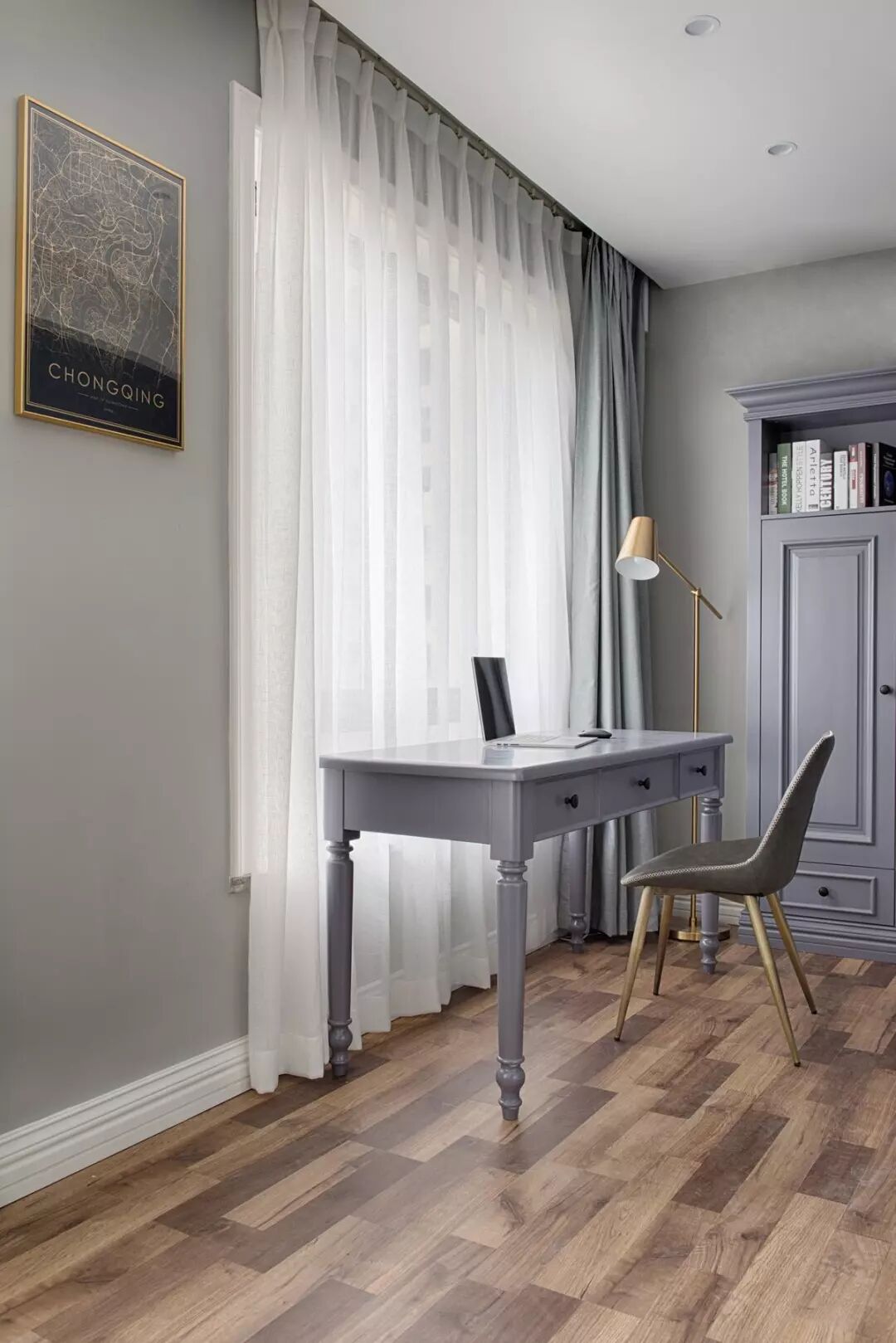 ▲ 相对的,阳台另一侧则是蓝灰色的书房空间,各自都有专属的办公区域。