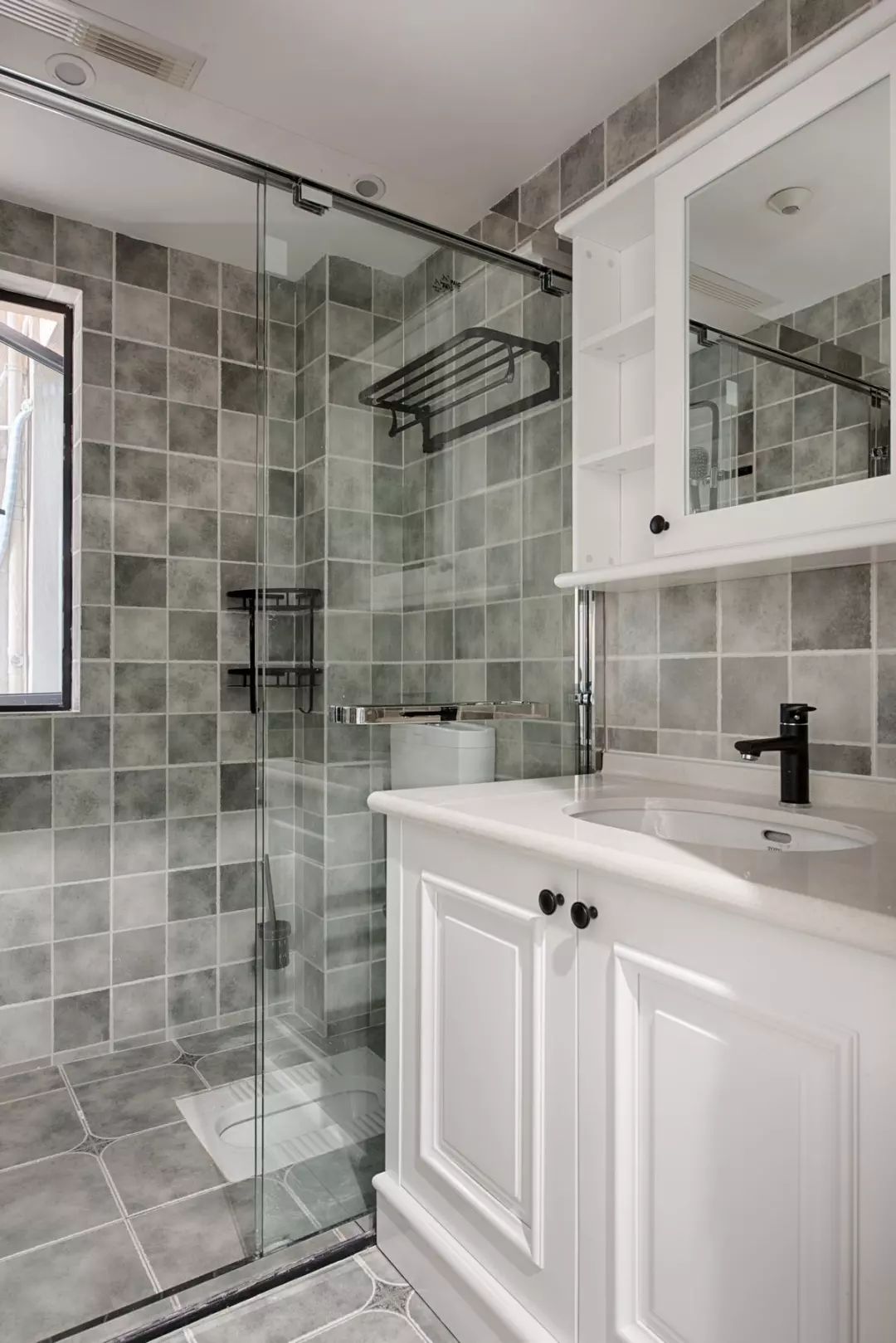 ▲ 灰色调的卫浴空间搭配白色洗手盆,简约舒适,把蹲坑移入淋浴间也更好地利用了空间。