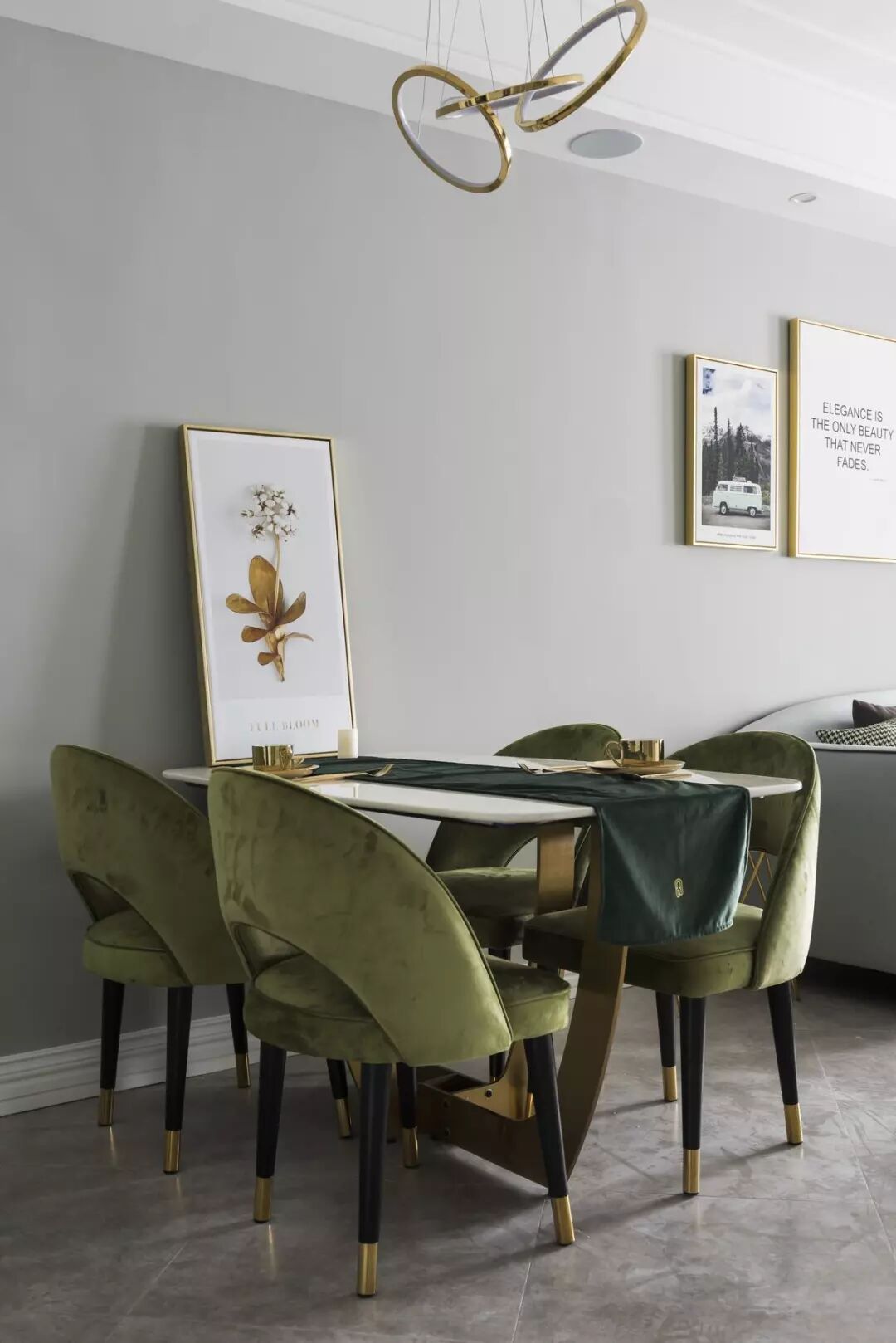 ▲ 餐厅,大理石餐桌搭配抹茶色餐椅,再点缀以金属质感,流露出对精致品位生活的追求。